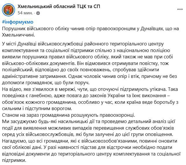 Областной ТЦК позже заявил, что мужчина нарушил правила воинского учета, и сейчас его разыскивают правоохранители.