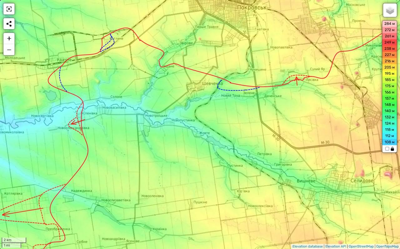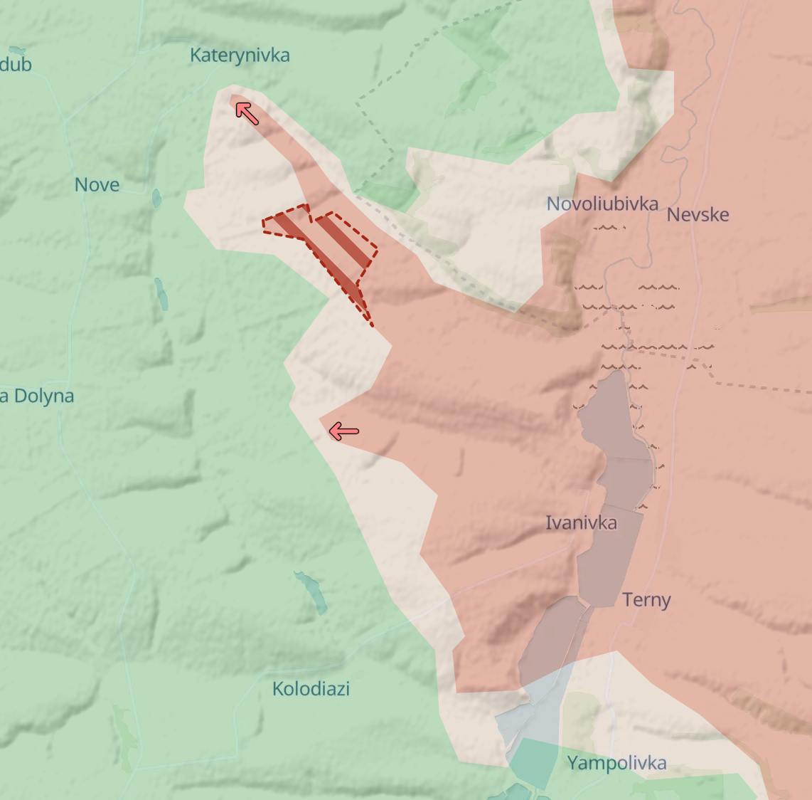 Продвижение россиян фиксирует и украинский паблик Deep State. По его данным, за последние несколько дней войска РФ заняли ряд территорий в районе Котляровки, Преображенки и Надеждинки, а также севернее, в районе Успеновки.