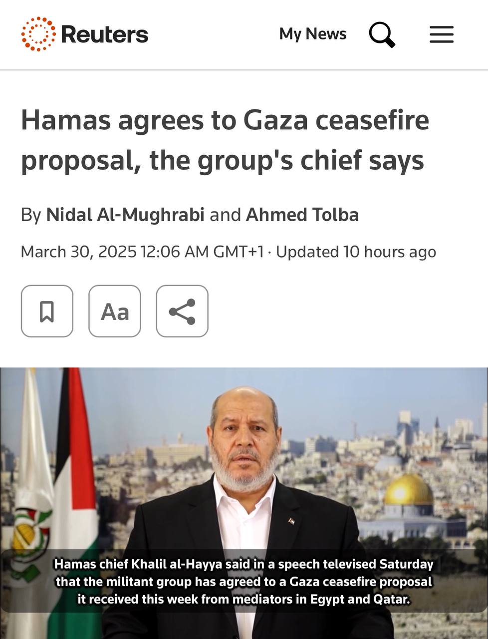 "Два дня назад мы получили предложение от посредников из Египта и Катара. Мы отнеслись к нему положительно и приняли его", - заявил Халиль аль-Хайя в своем телевизионном выступлении.