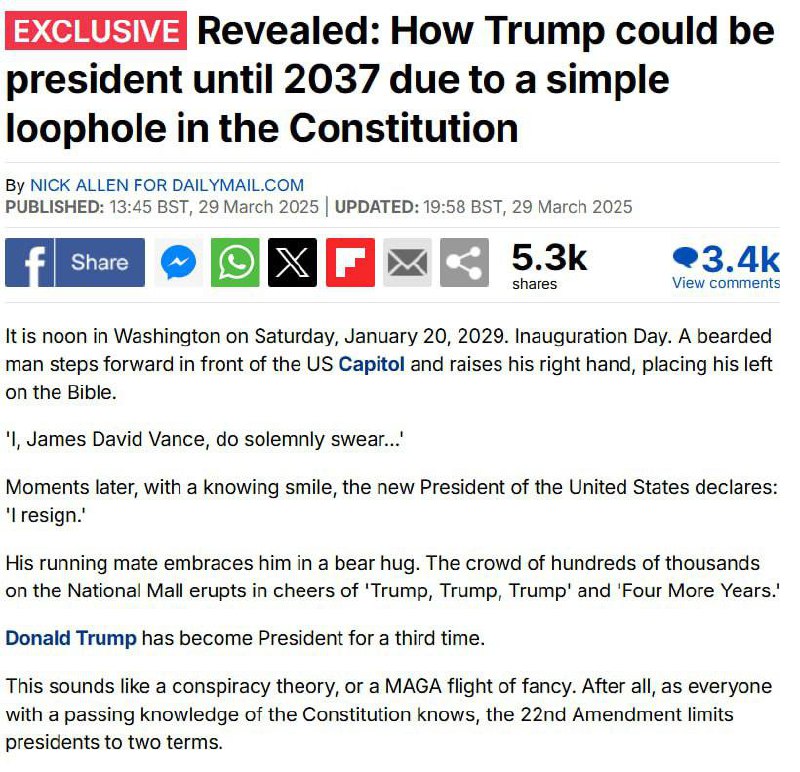 Таким образом, Трамп мог бы баллотироваться на пост вице-президента, а Джей Ди Вэнс на президента. После приведения к присяге Вэнс может уйти в отставку, позволив своему вице-президенту Трампу занять его пост.
