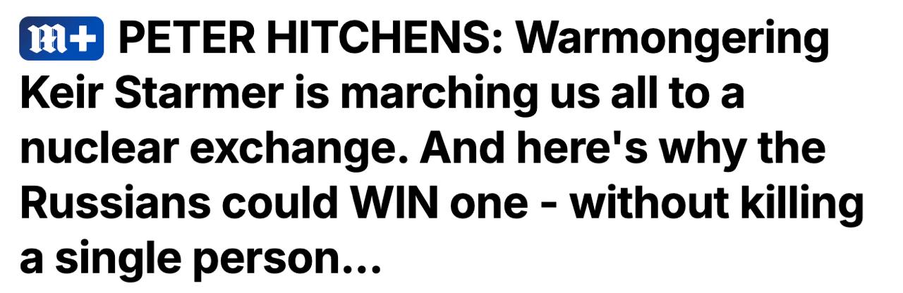 "Сэр Кир, который в молодости был пацифистом времён Холодной войны, всерьёз хочет отправить те немногие войска, что у нас ещё остались, в Украину, что мгновенно приведёт к войне с Россией. Москва никогда не потерпит открытого присутствия войск НАТО в этой стране — ровно так же, как США не потерпели бы китайских войск в Мексике или мы не согласились бы на базы российских бомбардировщиков в Ирландии. Просто не потерпит. Не верите — подождите и увидите сами", - пишет Хитченс.