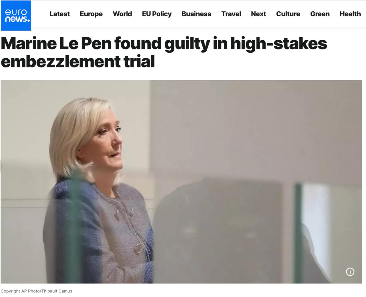 Исправительный суд Парижа приговорил лидера ультраправой французской партии "Национальное объединение" Марин Ле Пен к четырем годам тюремного заключения, два из которых будут условными, домашнему аресту с ношением электронного браслета, штрафу в размере 100 000 евро и пяти годам невозможности избрания в органы власти.