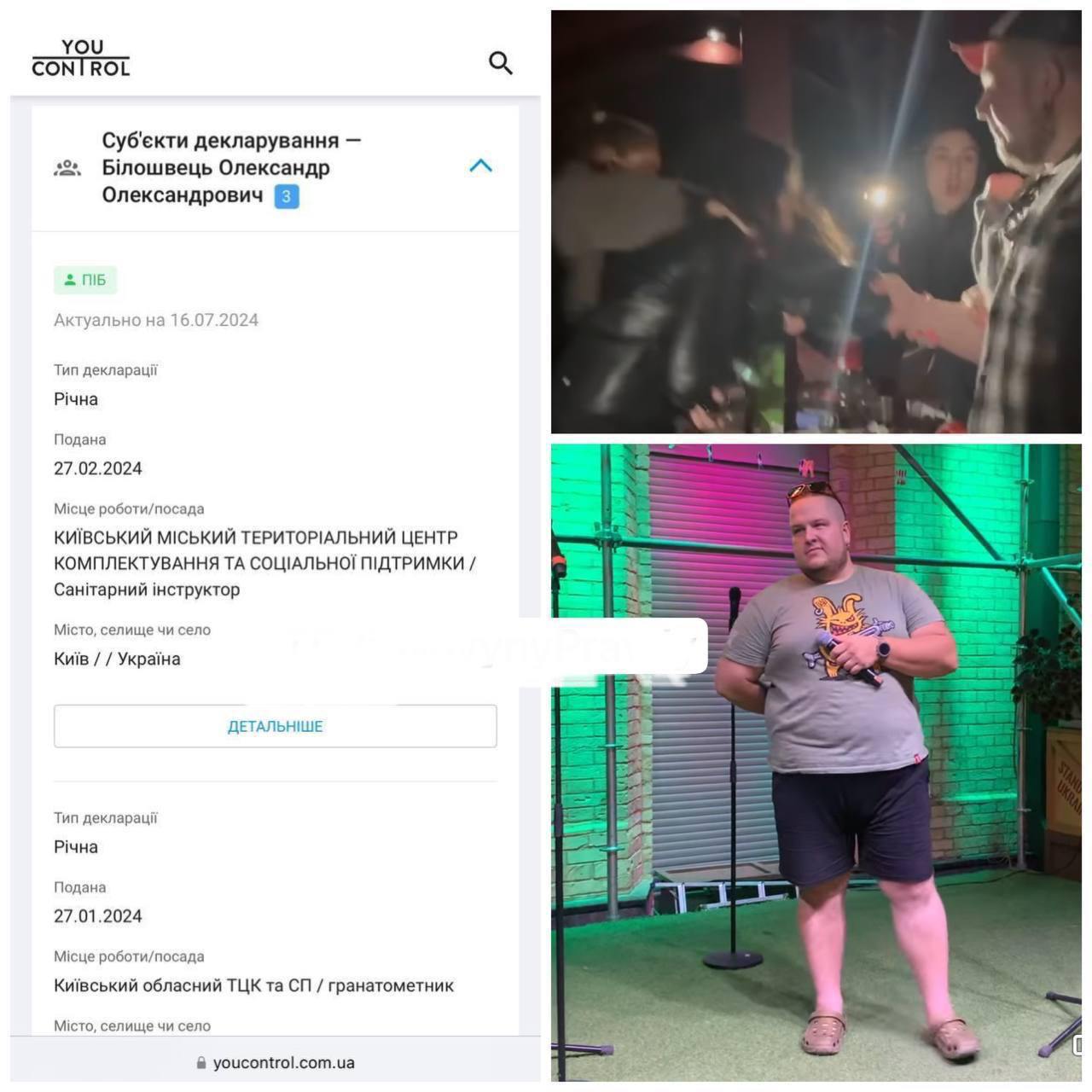 Как оказалось, зачинщиком потасовки с женщинами оказался Александр Белошвец. Как следует из его прошлогодней декларации, он числится санитарным инструктором в Киевском городском ТЦК. Также в декларации указано, что он гранатометчик.