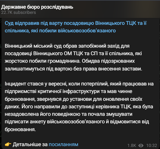 "Винницкий городской суд избрал меру пресечения для должностной лица Винницкого ОГ ТЦК и СП и ее сообщника, которые жестоко избили гражданина. Оба подозреваемых будут оставаться под стражей без права внесения залога", - говорится в сообщении.