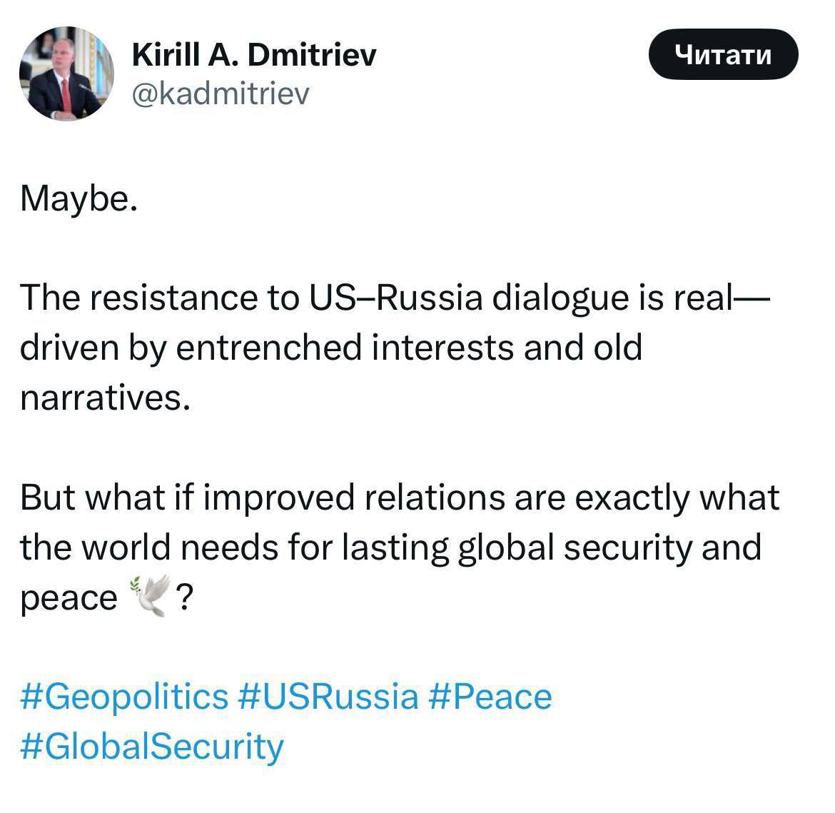 "Сопротивление диалогу между США и Россией существует из-за укоренившихся интересов и старых нарративов. Но что, если улучшение отношений - это именно то, что нужно миру для долгосрочной глобальной безопасности и мира?" – написал он.