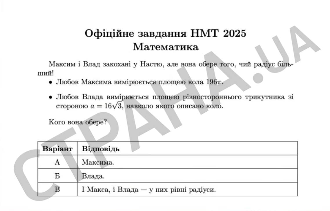В одном из заданий НМТ по математике ученикам предлагают решить, кого из двух влюбленных парней выберет Настя