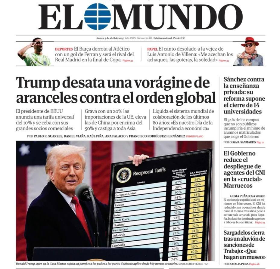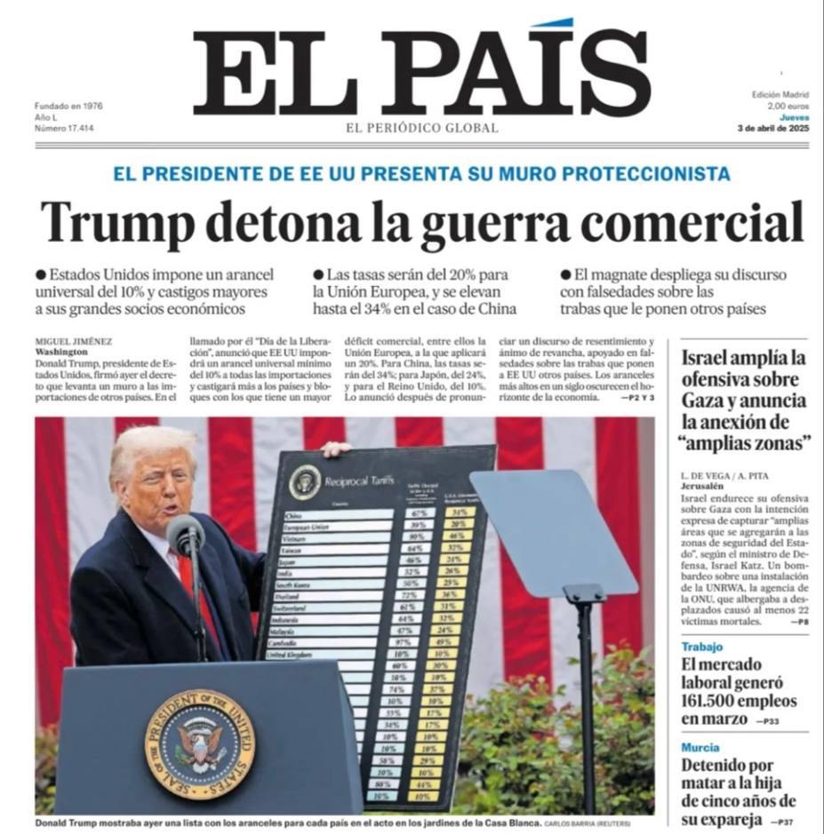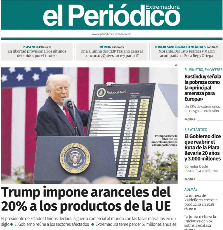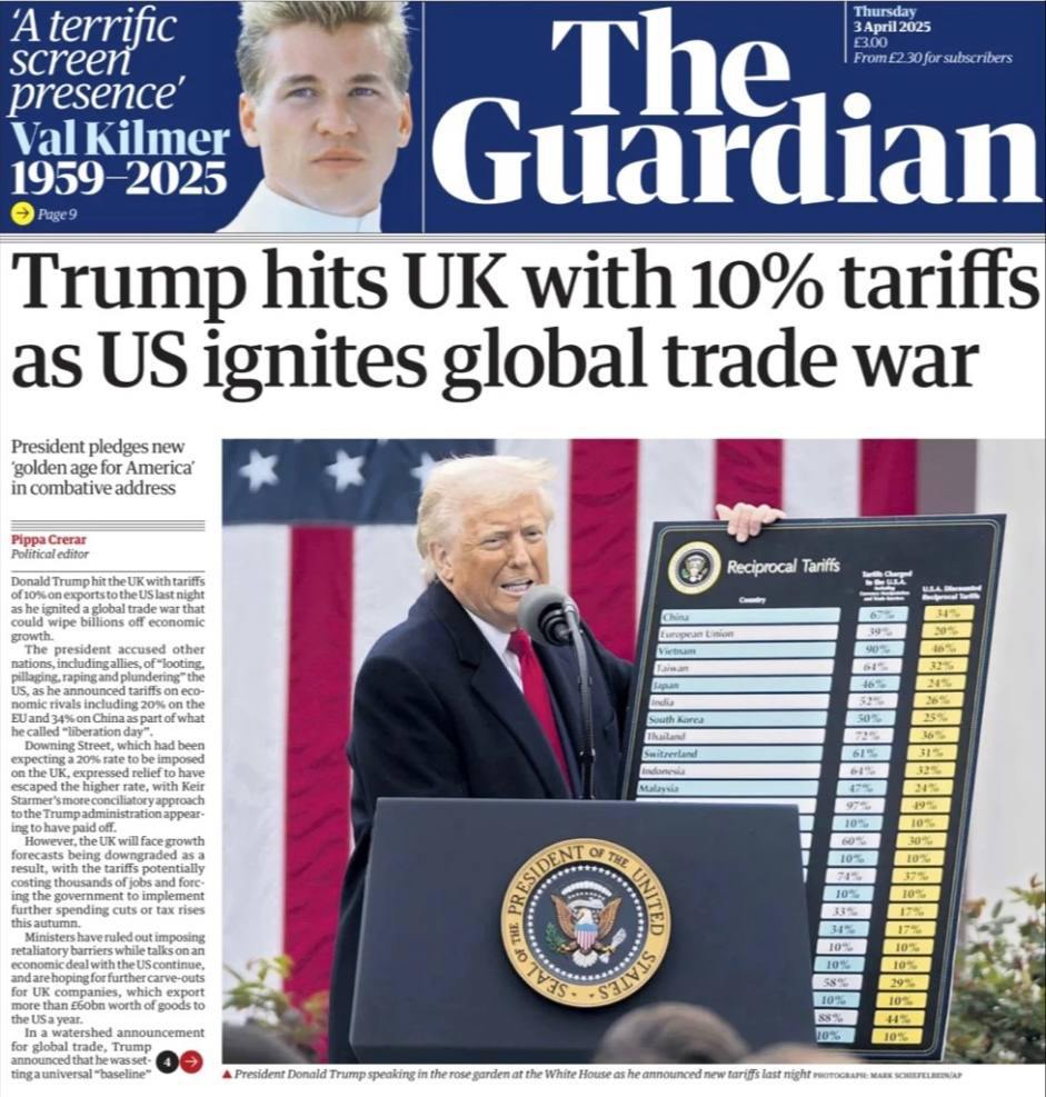 "Трамп развязывает вихрь пошлин против мирового порядка", "Трамп против всего мира", "Трамп развязывает торговую войну", "Трамп наложил на Евросоюз пошлину в 20%", "Великобритания избежала худших тарифов, поскольку Трамп бьет "иностранных мошенников"".