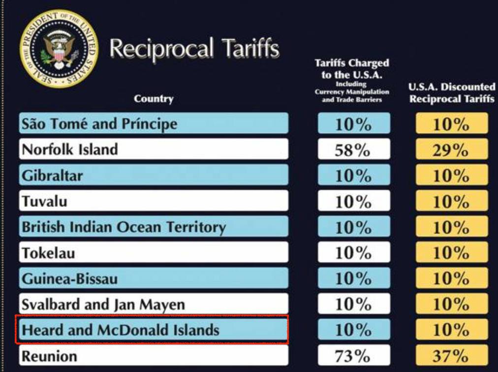 При этом сама территория, где периодически появляются только ученые, входит в состав Австралии, против которой тариф также составил 10%.