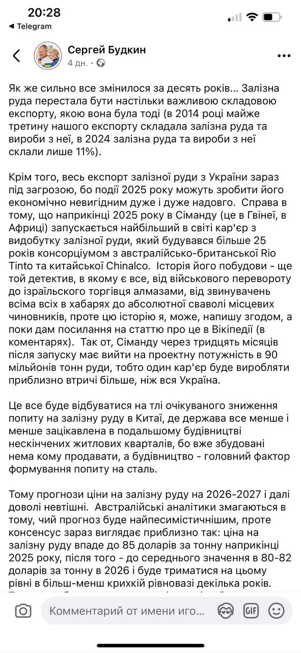 "События 2025 могут сделать его (украинский экспорт железной руды - Ред.) экономически невыгодным очень и очень надолго. Дело в том, что в конце 2025 года в Симанду (это в Гвинее, в Африке) запускается самый большой в мире карьер по добыче железной руды, который строился более 25 лет консорциумом из австралийско-британской Rio Tinto и китайской Chinalco", – сообщил он.