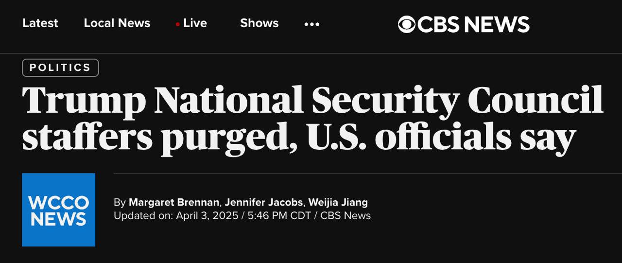Президент США Дональд Трамп уволил главу Агентства национальной безопасности страны Тимоти Хо, его заместительницу Венди Нобл, директора по разведке национальной безопасности Брайана Уолша, старшего директора по вопросам законодательства Томаса Будри и старшего директора по технологиям и нацбезопасности Дэвида Фейта после жалобы на них правой активистки.