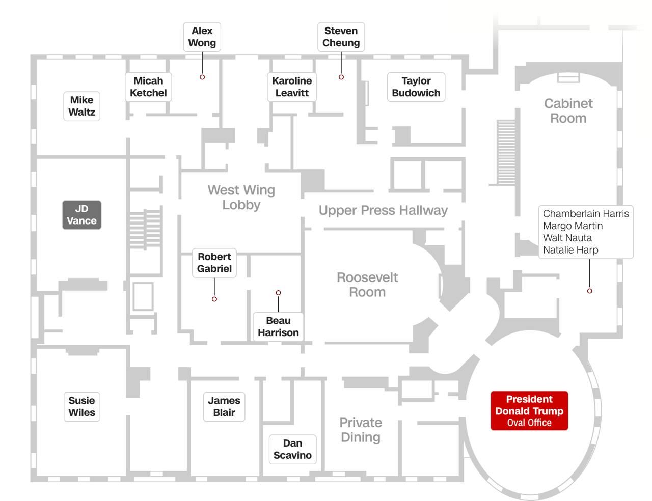 В конце коридора от кабинета Уайлс расположен офис вице-президента Джея Ди Вэнса, где также работает его глава аппарата Джейкоб Резес. Рядом с ним находится кабинет советника по национальной безопасности Майка Уолтца.