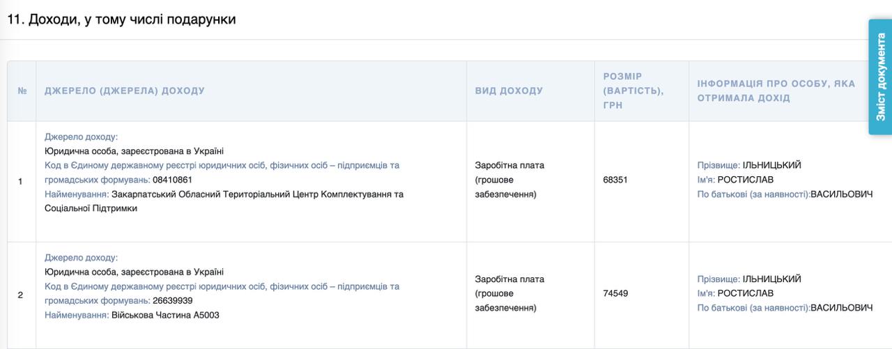 О работе 32-летнего Ильницкого в ТЦК стало известно из его декларации. В ней указано, что в 2024 году он получил денежное довольствие в двух структурах: воинской части А5003 (74,5 тысяч гривен) и Закарпатском областном ТЦК и СП (68 тысяч гривен).