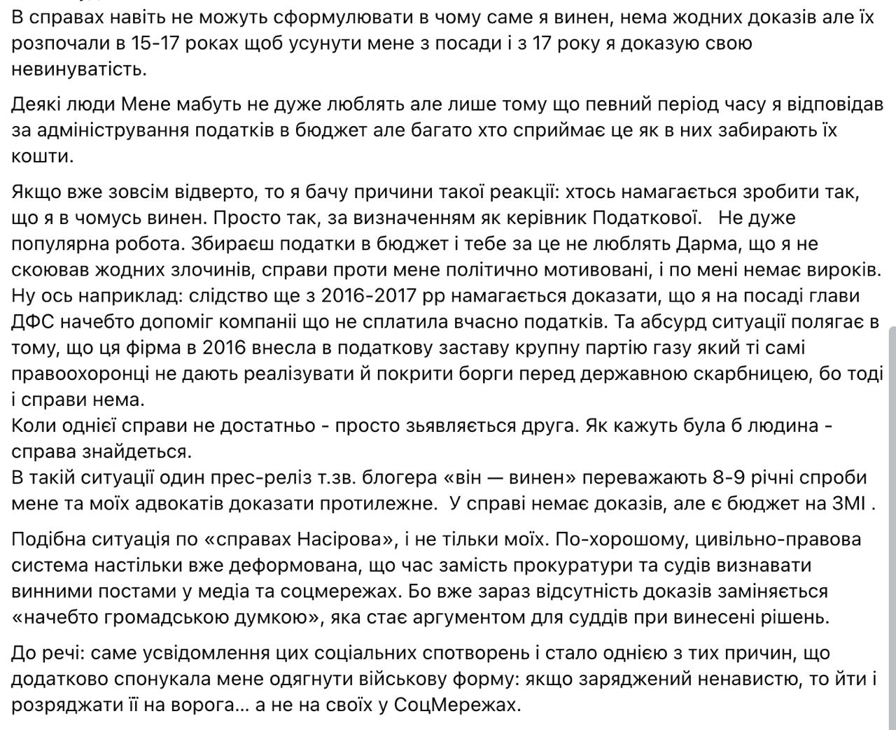 "Я изъявил желание и готовность служить, раньше при определенных обстоятельствах сделать это не мог. Война, к сожалению, продолжается, я готов служить и быть полезным и хоть как-то помочь и подменить ребят, которые служат уже 3 года. Я пошел служить по собственному решению и желанию в обычную военную часть, выполняющую задачи на фронте и в Киеве – солдатом на должность сапера", - пишет Насиров.