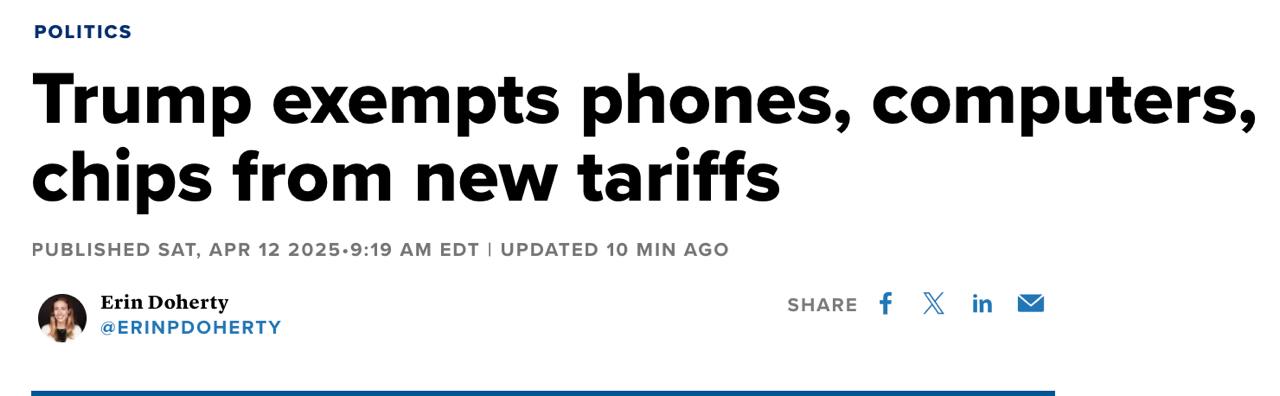 "Эти товары в конечном итоге могут облагаться дополнительными пошлинами, но они, вероятно, будут ниже, чем 145-процентная ставка, которую Трамп ввел на товары из Китая", - говорится в заявлении издания.
