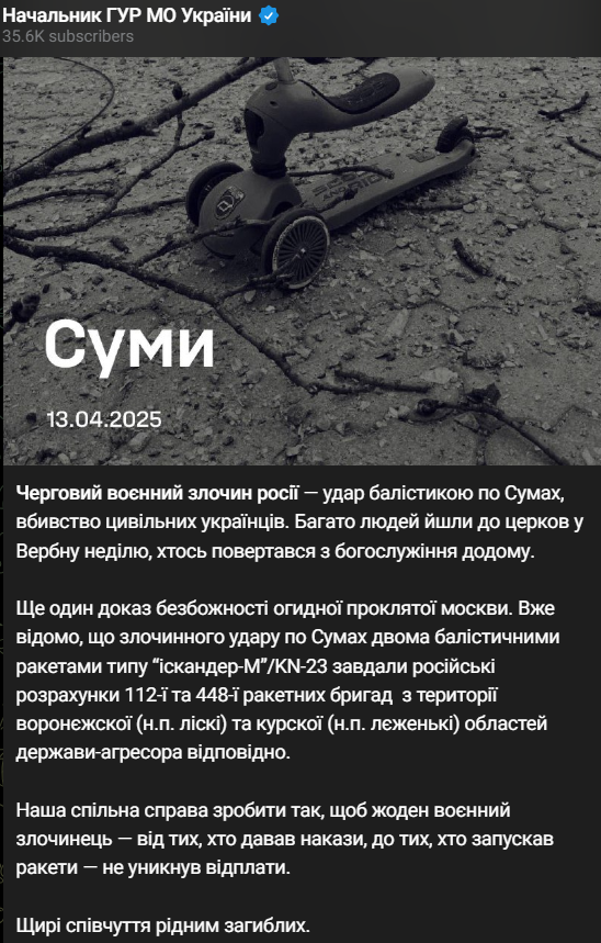 Еще одно доказательство безбожия отвратительной проклятой москвы. Уже известно, что преступный удар по Сумам двумя баллистическими ракетами типа "Искандер-М"/KN-23 нанесли российские расчеты 112-й и 448-й ракетных бригад с территории воронежской (н.п. лески) и курской (н.п. леженьки) областей", - написал глава ГУР.