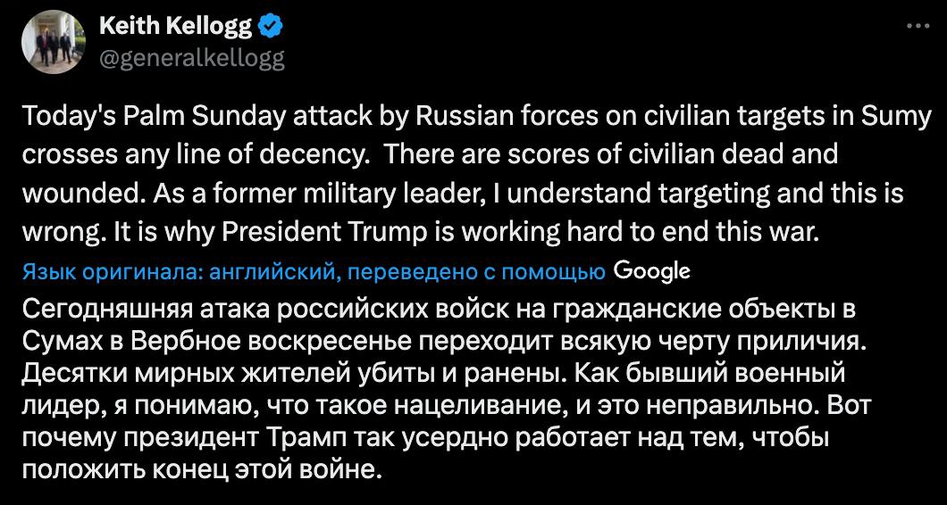 "Сегодняшняя атака российских войск на гражданские объекты в Сумах в Вербное воскресенье переходит всякую черту приличия. Десятки мирных жителей убиты и ранены. Как бывший военный лидер, я понимаю, что такое нацеливание, и это неправильно. Вот почему президент Трамп так усердно работает над тем, чтобы положить конец этой войне", - написал Келлог в Х.