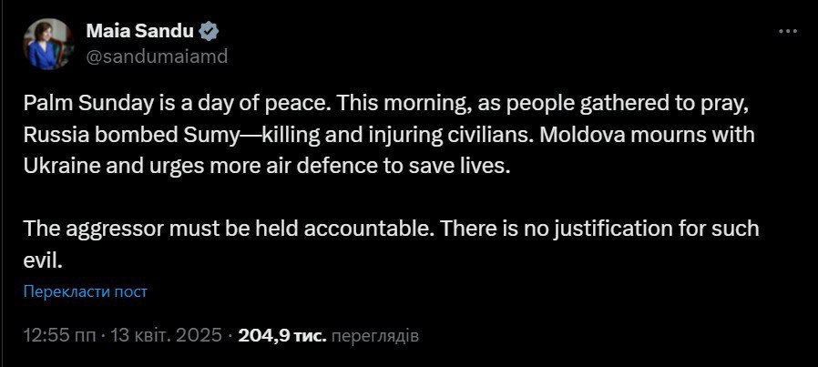 Другие мировые лидеры также отреагировали на обстрел города Сумы. Соболезнования выразили президенты Литвы Гитанас Науседа и Молдовы Майя Санду, а также глава МИД Эстонии Маргус Тсахкна.