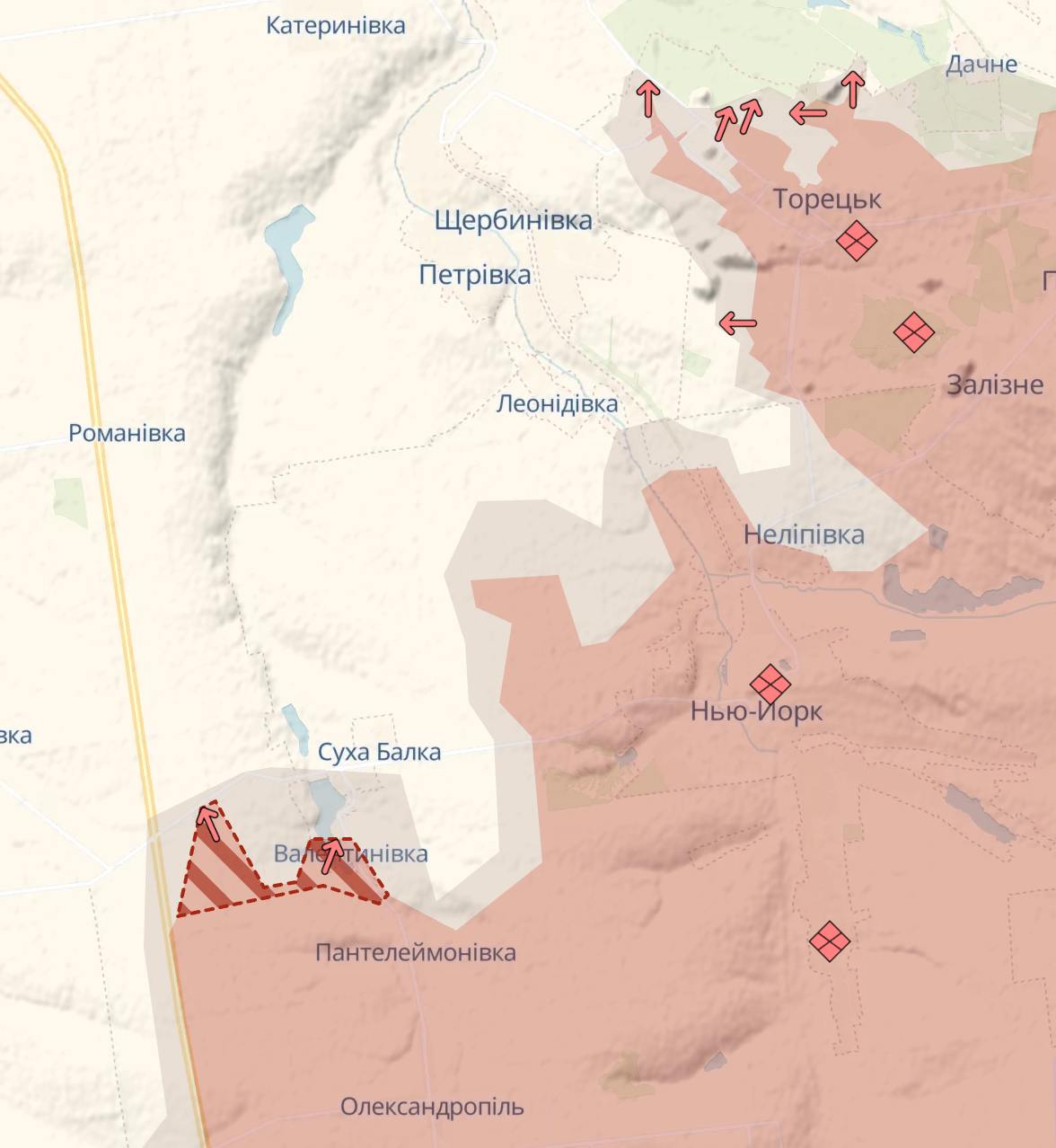 Под Торецком РФ заняла новые позиции в районе Валентиновки (по трассе в сторону Константиновки).