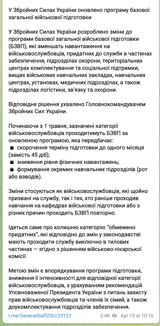 Изменения утверждены главнокомандующим ВСУ по рекомендации омбудсмена, чтобы снизить интенсивность подготовки людей с проблемами здоровья.