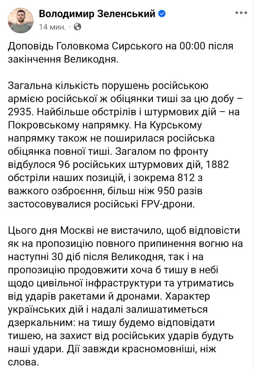 "Характер украинских действий и дальше будет зеркальным: на тишину будем отвечать тишиной, в защиту от российских ударов будут наши удары. Действия всегда более красноречивы, чем слова", - заявил президент, комментируя окончание назначенного Путиным пасхального перемирия.
