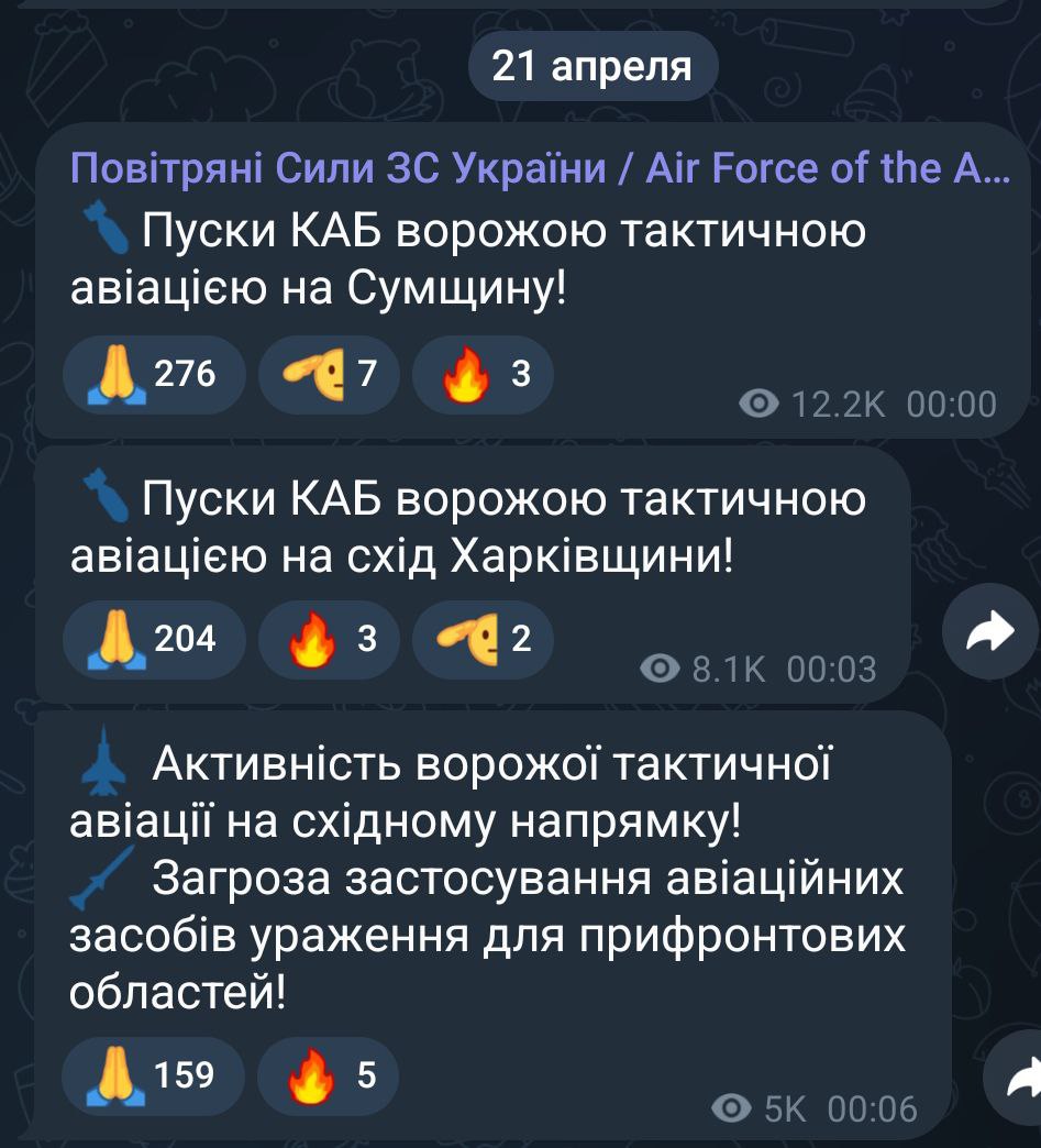 Тем временем РФ возобновила воздушные удары по Украине. Воздушные силы ВСУ сообщили о пусках КАБ по Харьковской и Сумской областям.
