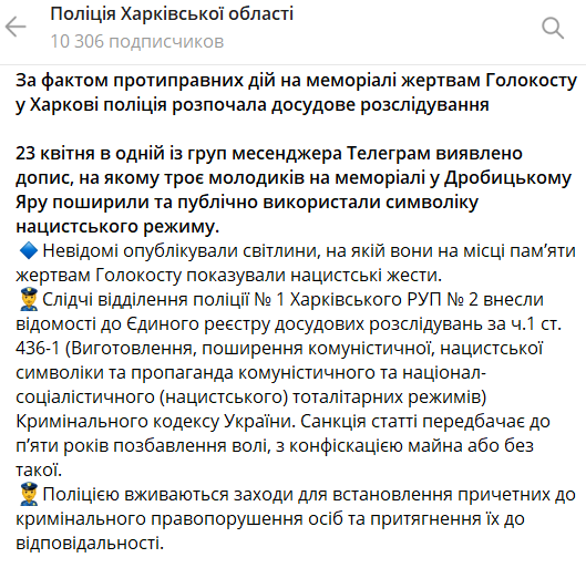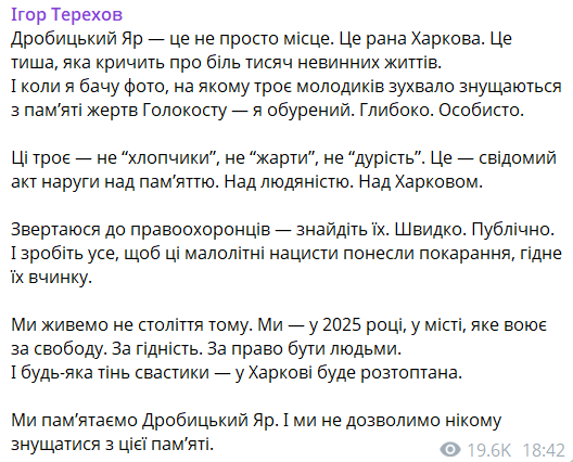 "Эти трое - не "мальчики", не "шутки", не "глупость". Обращаюсь к правоохранителям - найдите их", - прокомментировал ситуацию в своем телеграм-канале мэр Харькова Игорь Терехов.