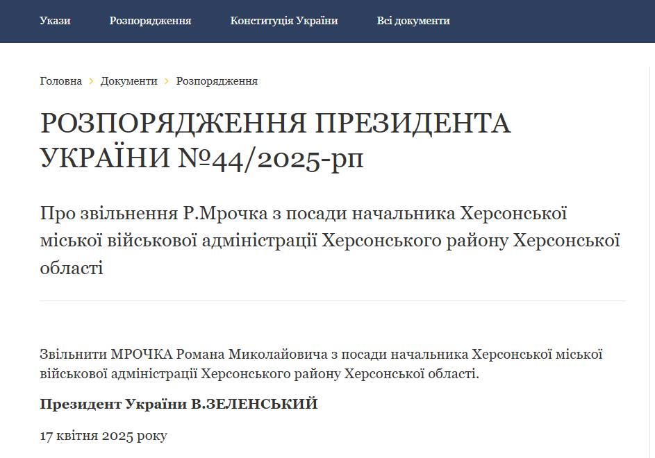 "Уволить Мрочко Романа Николаевича с должности начальника Херсонской городской военной администрации Херсонского района Херсонской области", - сказано в тексте документа.