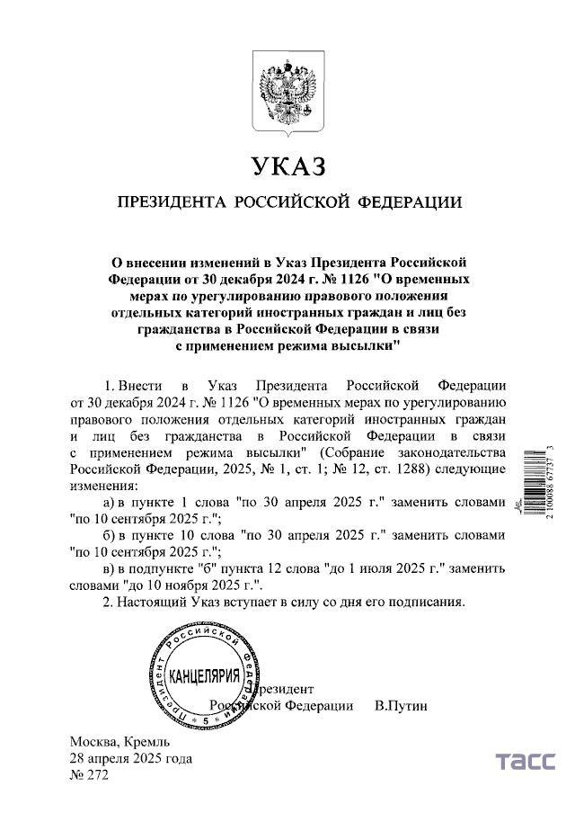 Российский лидер Владимир Путин продлил до 10 сентября срок, в который иностранцы должны узаконить свое положение в РФ.
