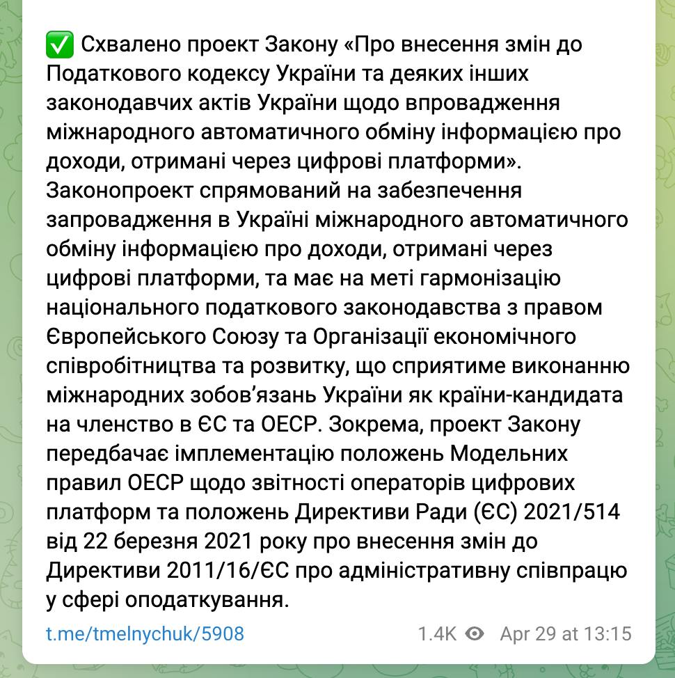 Об этом сообщает представитель правительства в парламенте Тарас Мельничук в своем телеграм-канале.