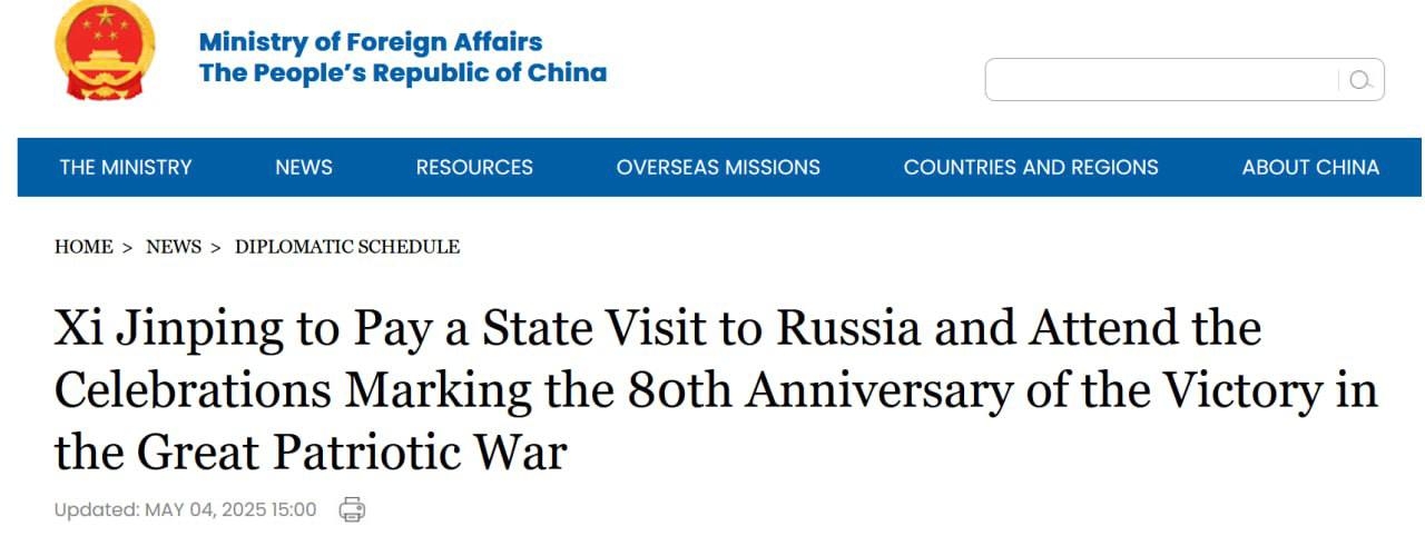 "По приглашению президента Российской Федерации Владимира Путина председатель КНР Си Цзиньпин с 7 по 10 мая посетит Россию с государственным визитом и примет участие в торжествах по случаю 80-й годовщины победы во Второй мировой войне в Москве", - говорится в сообщении.
