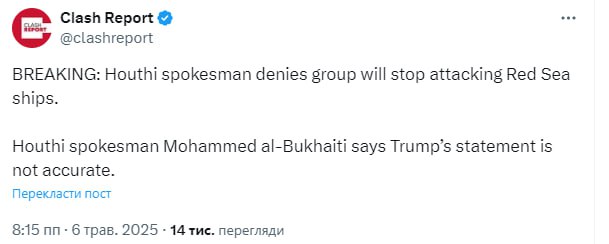 Вместе с этим, по информации Clash Report, представитель йеменских хуситов Мухаммед аль Букаити опроверг заявление о прекращении огня в Красном море, заявив, что "информация, озвученная Трампом, не соответствует действительности".