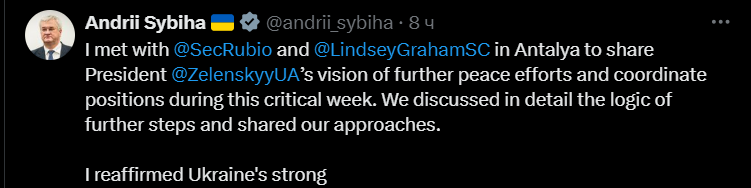 Глава МИД Украины Андрей Сибига уже в Турции, где встретился с государственным секретарем США Марко Рубио и сенатором Линдси Грэмом.