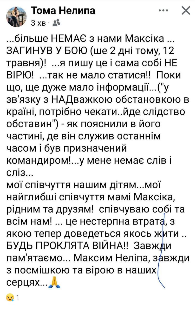 "Больше нет с нами Максика. Погиб в бою. Я пишу это и сама себе не верю. Так не должно было произойти. Пока еще мало информации. В связи со сверхтяжелой обстановкой в стране нужно ждать, идет следствие обстоятельств", - написала она.