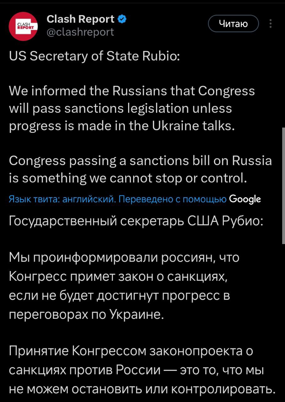 Конгресс США примет закон о санкциях против РФ, если не будет прогресса в переговорах по Украине - Рубио
