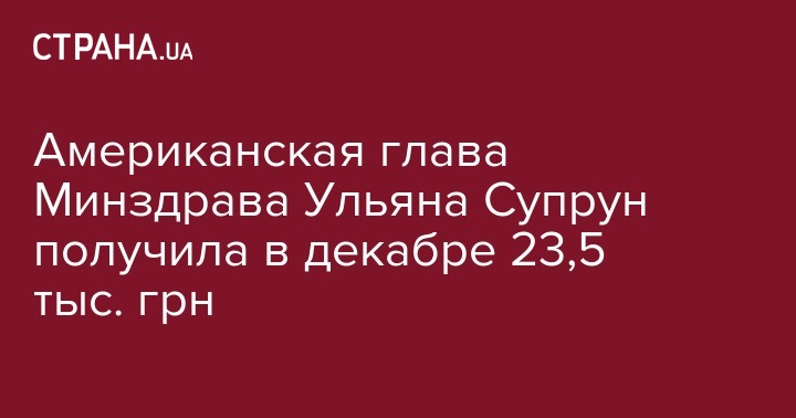 Зарплата исполняющей обязанности министра здравоохранения Ульяны Супрун за декабрь составила 23 675,43 гривны. Об этом сообщают "Украинские Новости"