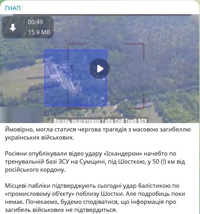Позже бывший офицер ВСУ Дмитрий Гнап сообщил, что удар по тренировочной базе ВСУ в Сумской области, о которой сообщали россияне, мог иметь место.