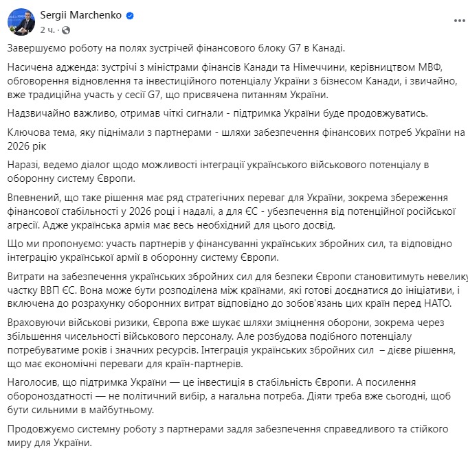 "Ключевая тема, которую поднимали с партнерами – пути обеспечения финансовых потребностей Украины на 2026 год. Сейчас ведем диалог о возможности интеграции украинского военного потенциала в оборонную систему Европы... Что мы предлагаем: участие партнеров в финансировании украинских вооруженных сил и, соответственно, интеграция украинской армии в оборонную систему Европы. Расходы на обеспечение украинских вооруженных сил по безопасности Европы будут составлять небольшую долю ВВП ЕС", – рассказал министр.