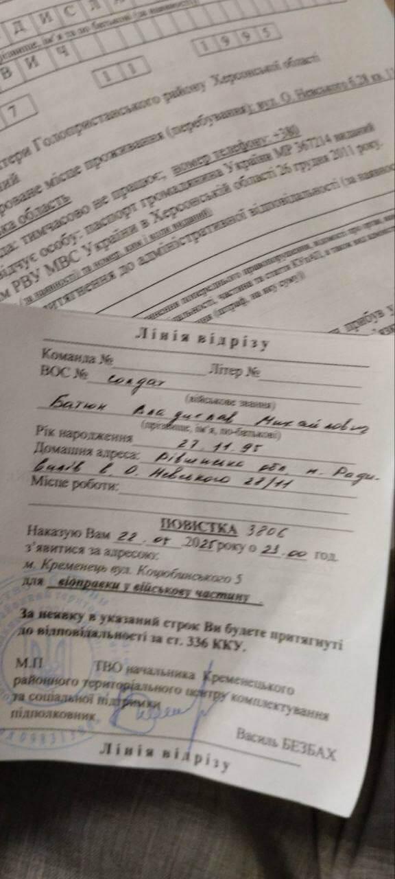 Ему выдали боевую повестку с требованием явиться в военкомат в тот же день в 23:00.