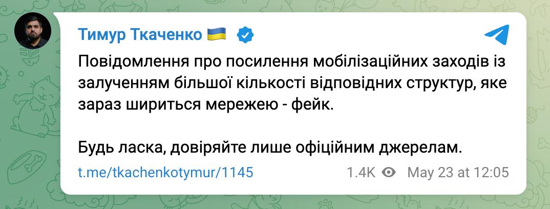 "Сообщение об усилении мобилизационных мер с привлечением большего количества соответствующих структур, которое сейчас распространяется по сети - фейк", - написал он.