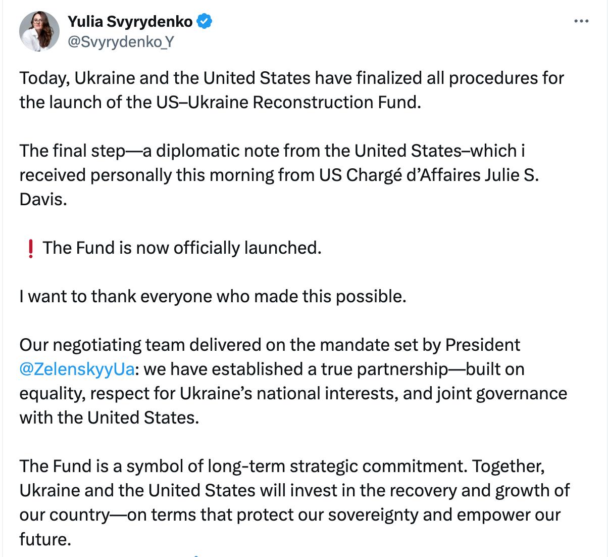 Украина и США завершили все необходимые процедуры для запуска американско-украинского фонда восстановления в рамках ресурсного соглашения.