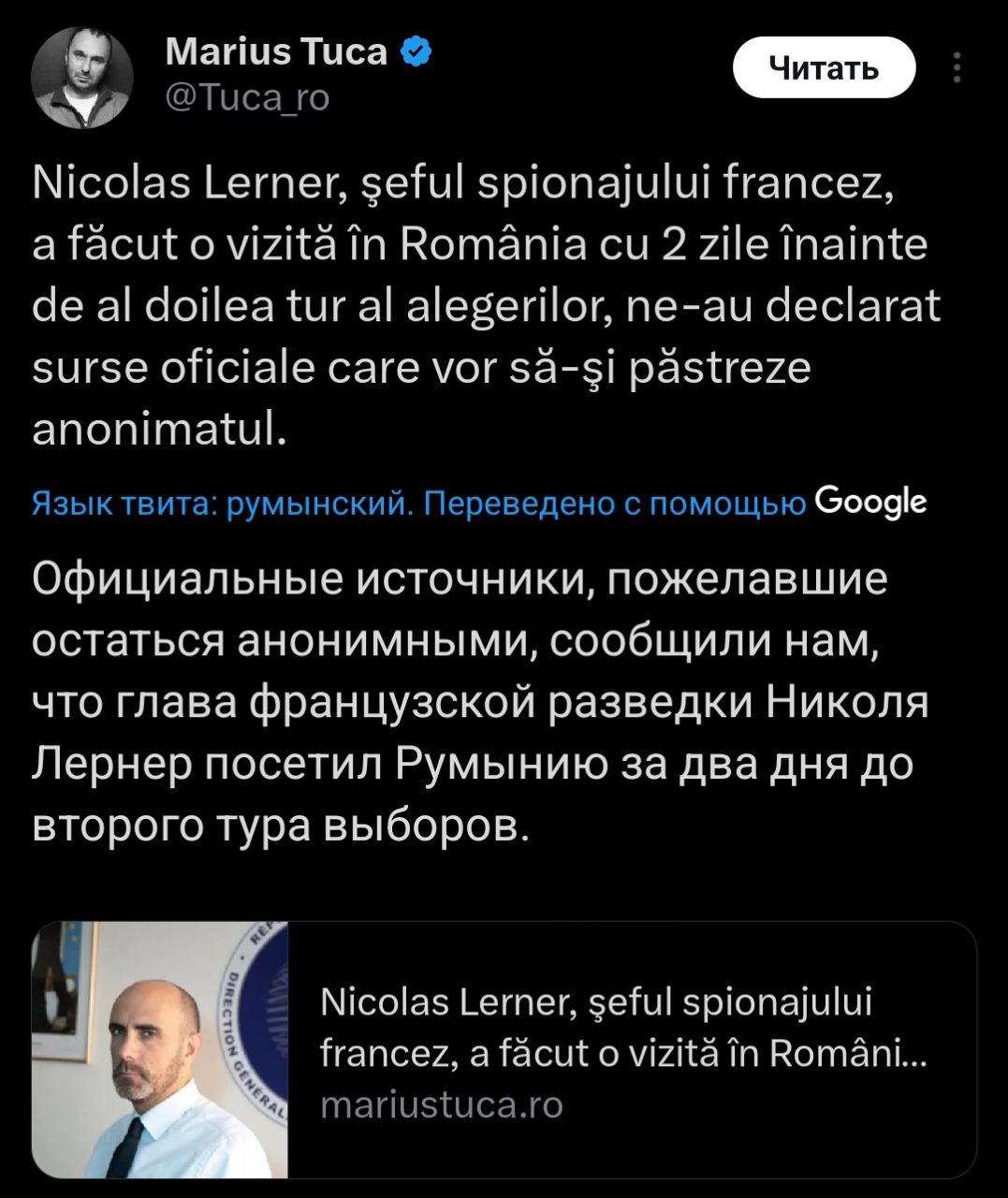 "Николя Лернер, глава внешней разведки Франции, который попросил меня заставить замолчать консервативные голоса в Telegram в Румынии перед выборами (и позже пытался это отрицать), посетил Румынию всего за два дня до голосования, сообщили официальные источники журналисту @tuca_ro", - написал предприниматель.