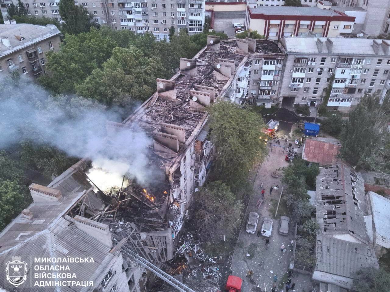 В Николаеве в результате ночной атаки БПЛА произошло попадание в пятиэтажный жилой дом. Возник пожар, сообщает ГСЧС.