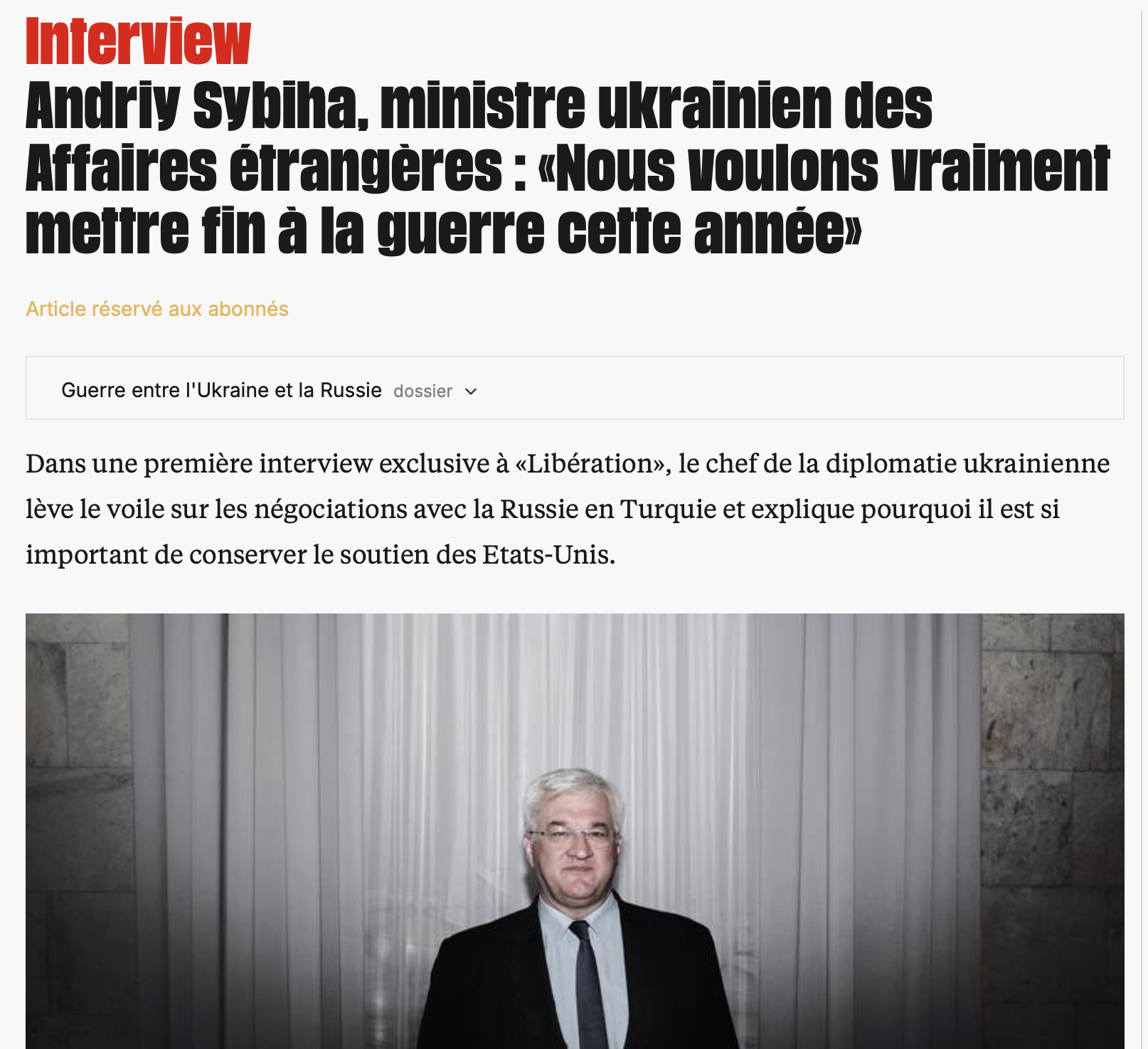 Об этом заявил глава Министерства иностранных дел Андрей Сибига во время интервью Libaration.