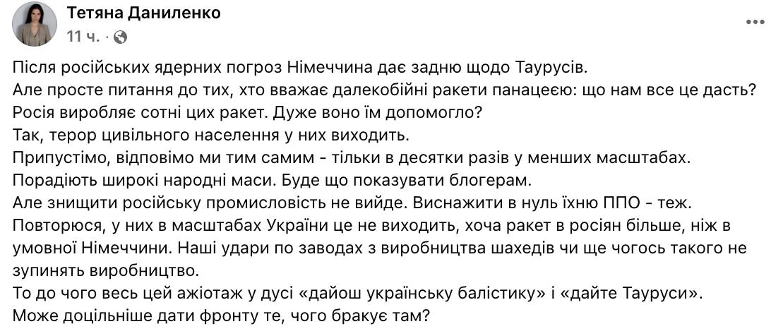 "Предположим, мы ответим тем же - только в десятки раз в меньших масштабах. Народ порадуется. Будет что блогерам показать. Но уничтожить российскую промышленность не получится. И истощить в ноль их ПВО - тоже. Повторюсь, у них это не выходит даже в масштабах Украины, хотя ракет у России больше, чем у условной Германии. Наши удары по заводам, где производят "Шахеды" или что-то подобное, не остановят производство", - пишет Даниленко.