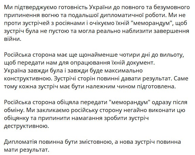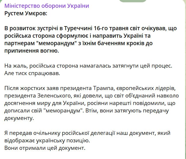 "Я передал главе российской делегации наш документ, отражающий украинскую позицию. Они получили этот документ. Мы подтверждаем готовность Украины к полному и безусловному прекращению огня и дальнейшей дипломатической работе. Мы не против встреч с россиянами и ожидаем их "меморандума", чтобы встреча была не пустой и могла реально приблизить завершение войны. Российская сторона имеет еще не менее четырех дней до вылета, чтобы передать нам для обработки их документ", – заявил министр обороны, косвенно подтвердив, что встреча может состояться 2 июня, как ранее сообщил глава МИД РФ Сергей Лавров.