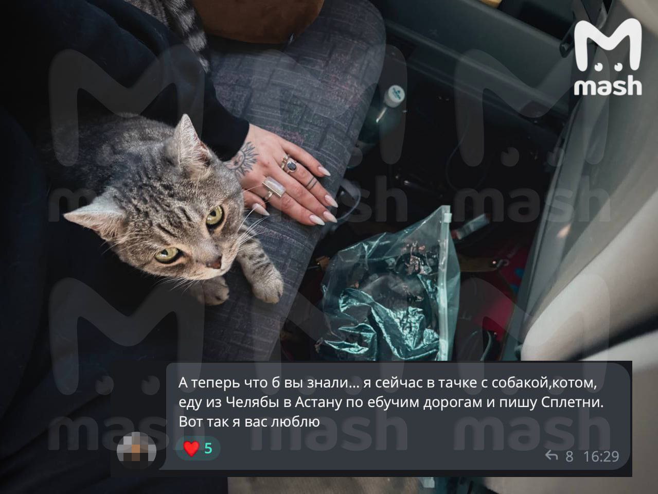 "А теперь чтобы вы знали. Я сейчас в тачке с собакой и котом, еду из Челябы (Челябинска - Ред.) в Астану по е@учим дорогам и пишу сплетни", - сказано в ее публикации.