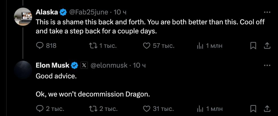 На предложение пользователя Х "остыть и сделать шаг назад", миллиардер ответил: "Хороший совет. Ок, мы не будем выводить Dragon из эксплуатации".