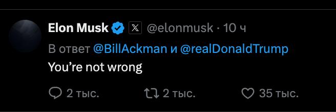 В похожем духе он ответил миллиардеру Биллу Акману, союзнику Трампа и Маска, который сказал, что они должны "заключить мир на благо нашей великой страны". На это Маск ответил: "Вы не ошибаетесь".