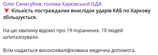 По данным Синегубова, бомбы упали в Шевченковском и Киевском районах города. Повреждено здание детской железнодорожной дороги, под удар попал частный жилой дом.