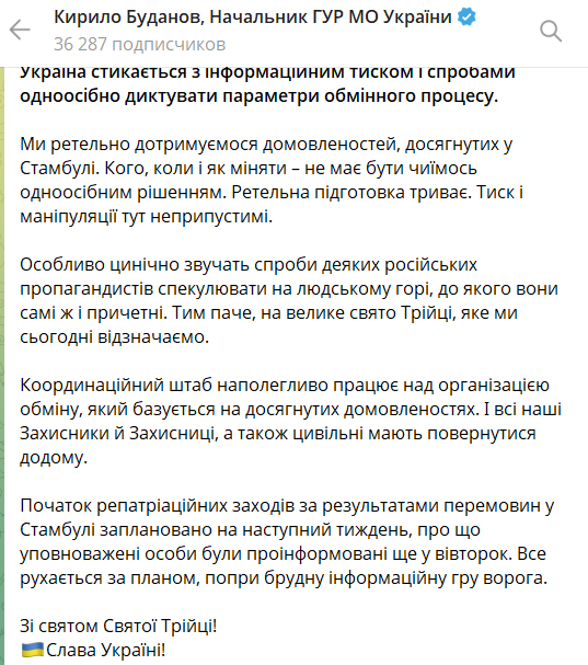 "Начало репатриационных мероприятий по результатам переговоров в Стамбуле запланировано на следующую неделю, о чем уполномоченные лица были проинформированы еще во вторник. Все движется по плану, несмотря на грязную информационную игру врага", - добавил он.